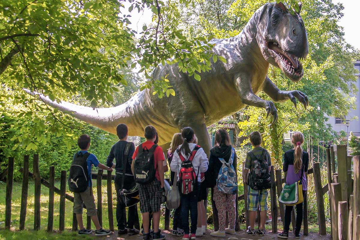 Bestaunen Sie mit den Kindern lebensgroße Dinosaurier des Erdmittelalters.